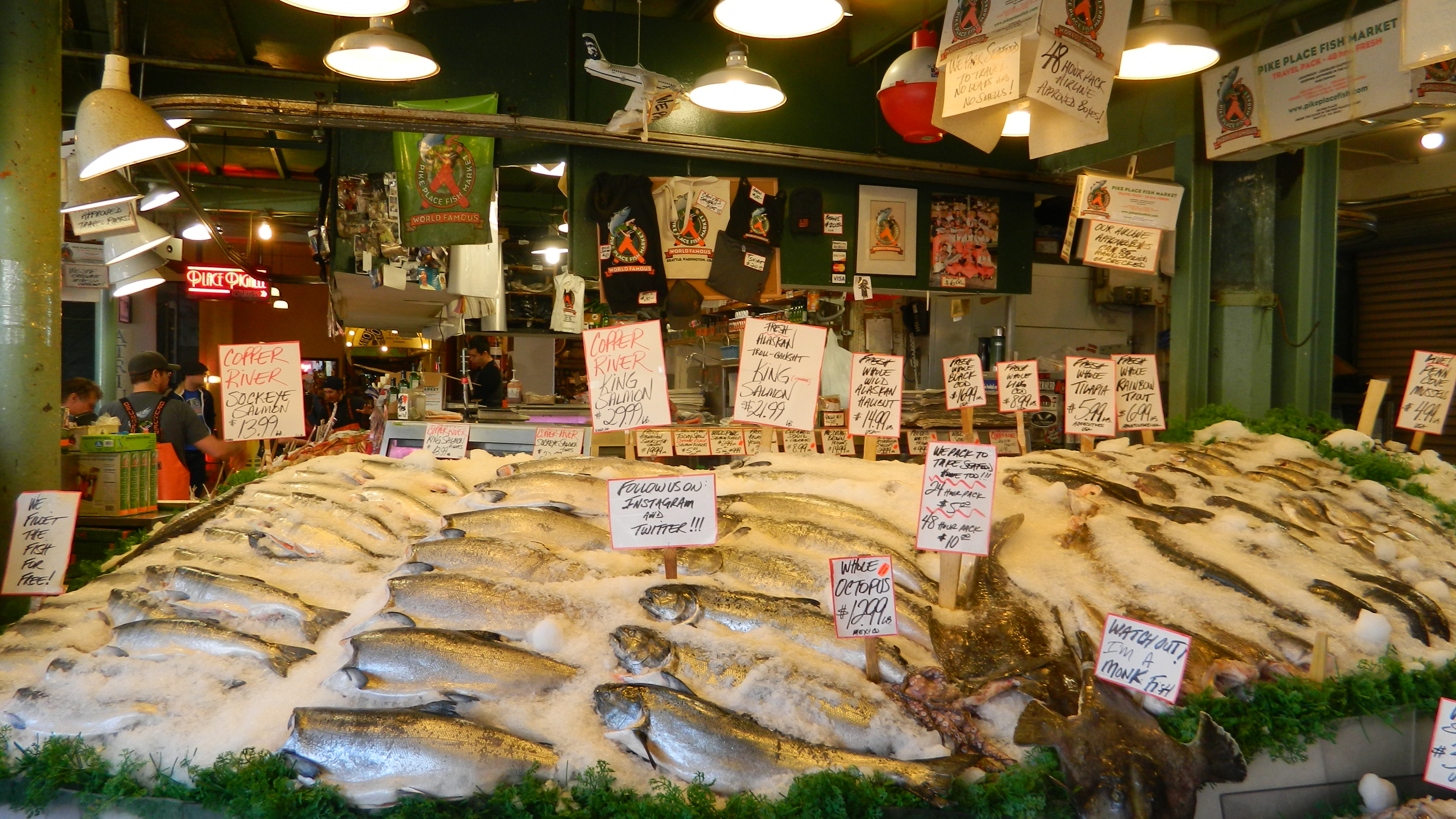 Back downtown I strolled along streets lined with skyscrapers, small boutique stores and large national department stores all the while navigating back to Pike Place Market. There I felt like I was stalking the most famous store front until I finally saw the Pike Place Fish Market guys throwing fish as people placed their orders. Northwest seafood lovers eagerly wait the Copper River salmon season that runs mid-May to mid-June and these large fish were literally flying out the door. Ok, well at least over the counter to be weighed, packed in ice and wrapped with sheets of newspaper before going home with some lucky person.